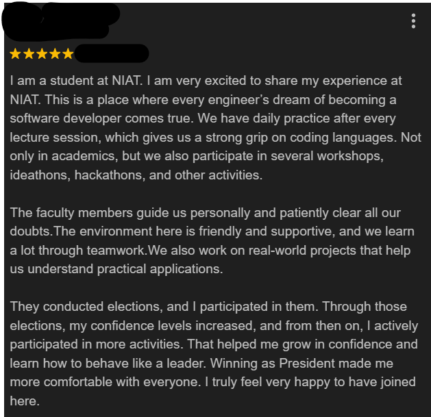 Students enrolled in the NIAT upskilling program at Vijayawada often highlight the practical learning approach and continuous mentorship support. Many students appreciate the early exposure to real-world projects, which helps them build confidence in applying technical skills. The structured guidance from trainers and mentors, along with regular feedback, plays a key role in improving problem-solving abilities and preparing students for industry expectations. Check some of the student reviews of NIAT Training Centre in Vijayawada.