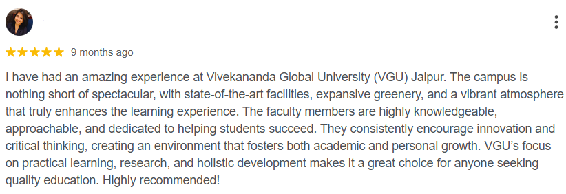 In this section, we delve into Vivekananda Global University reviews to understand what sets VGU Jaipur apart. From academics and placements to campus life and facilities, here’s what current students and alumni have to say about their journey at Vivekananda Global University Jaipur.