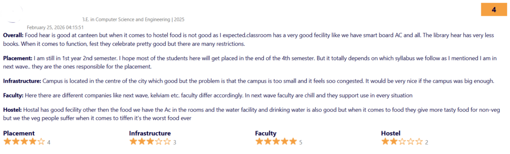 “The main aspect to join this college is that there is no traditional way of teaching in this college. they prepare us well for the real world applications. we have well teaching system in this college as it is perfect in all aspects, no need of improvements. we have moderate level of examination.”