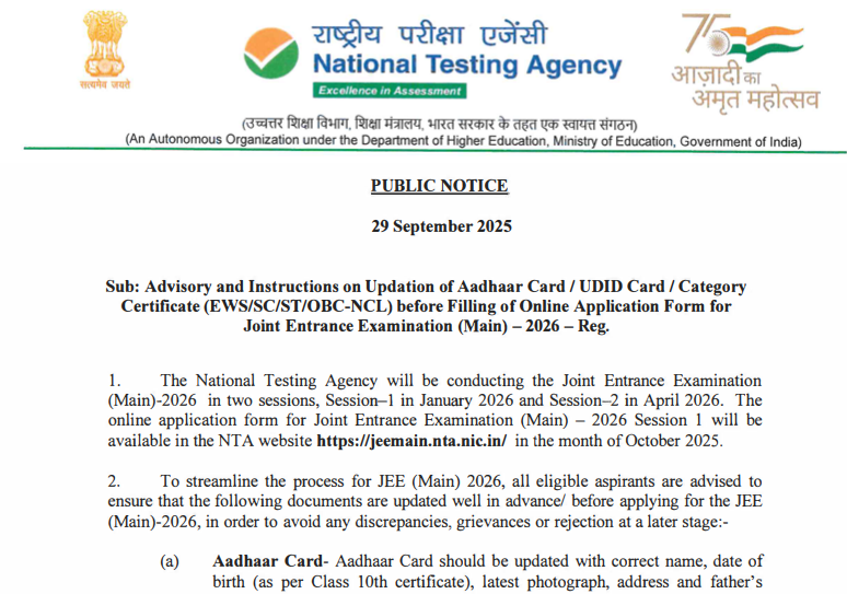 NTA on September 29, 2026, released Advisory and Instructions on Updation of Aadhaar Card/UDID Card/Category Certificate (EWS/SC/ST/OBC-NCL) to streamline the process for JEE Main 2026. All eligible aspirants are advised to make sure that the documents are updated well in advance/ before applying for the JEE, to avoid any discrepancies, grievances, or rejection at a later stage